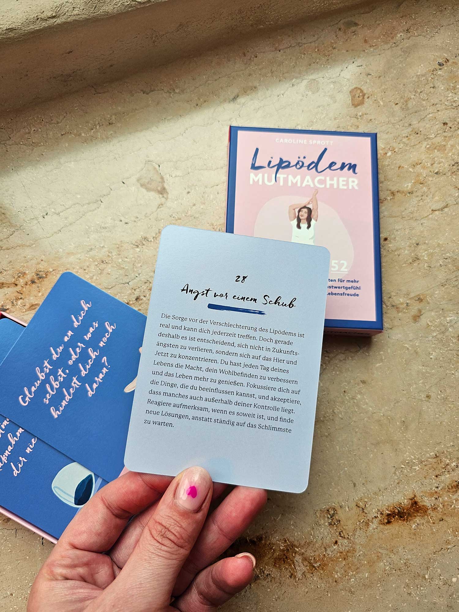 Lipödem-Betroffene leiden neben den körperlichen Symptomen, die die Diagnose mit sich bringt, häufig auch an psychischen Schmerzen. Das hat auch Caroline Sprott (@powersprotte) erlebt und weiß als 'Mutti der Lipödem-Comunity' genau, wie man es schafft, raus aus der Gedankenspirale und rein in ein liebevolles Verhältnis mit seinem Körper zu kommen. Affirmationen, Gedankenspiele, Fragen und Übungen helfen, Woche für Woche mehr Selbstwertgefühl zu entwickeln und sich Stück für Stück unbeschwerter zu fühlen. MIt 52 Karten für 52 Wochen.